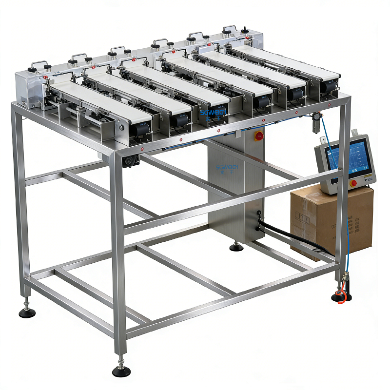 The Latest 6-Lane Stick Checkweigher is an online weight detection device specifically designed for multi-column high-speed production lines. It is suitable for packaging and dispensing processes requiring high capacity, high precision, and continuous automation.The Multi Lane Weight Checker can seamlessly connect to upstream multi-column forming, filling, counting, or repackaging equipment to achieve synchronous weighing, real-time judgment, and automatic rejection.